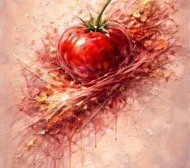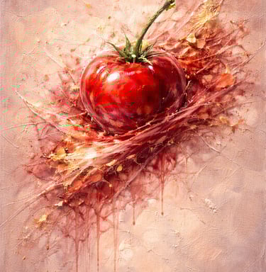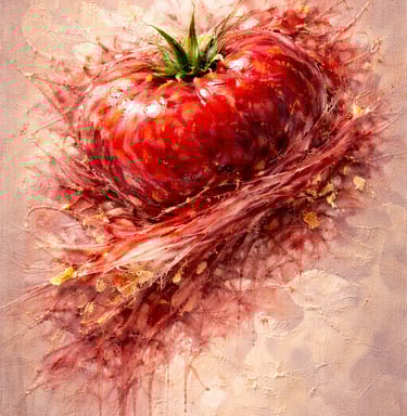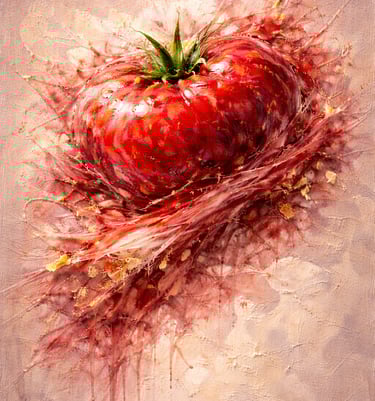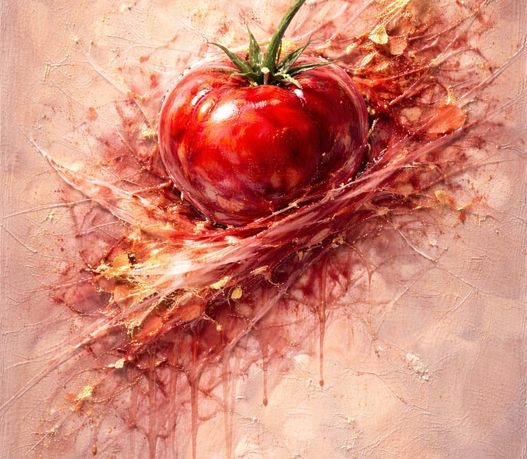 DÉLICE ROUGE s’inscrit dans cette relation intime à la tomate, abordée comme une matière expressive, vivante et pleinement assumée.