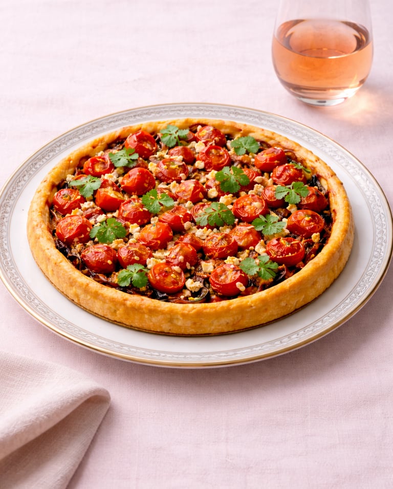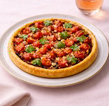 Tarte hivernale aux tomates confites, coriandre fraîche et huile piquante